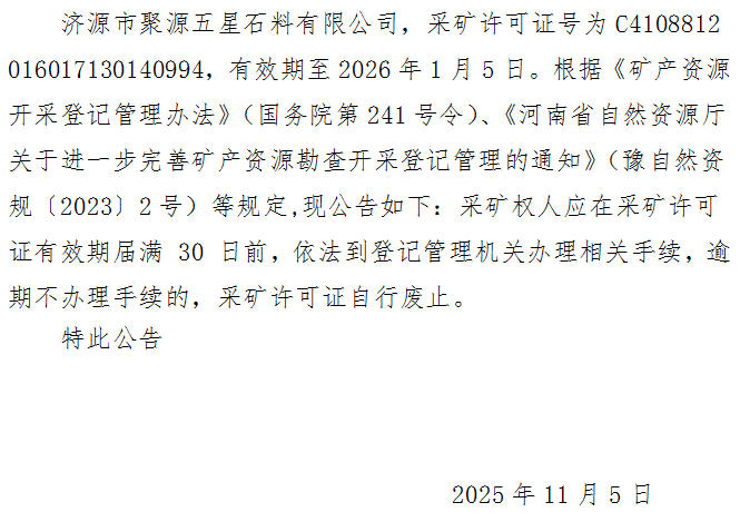 关于济源市聚源五星石料有限公司采矿许可证到期的公告