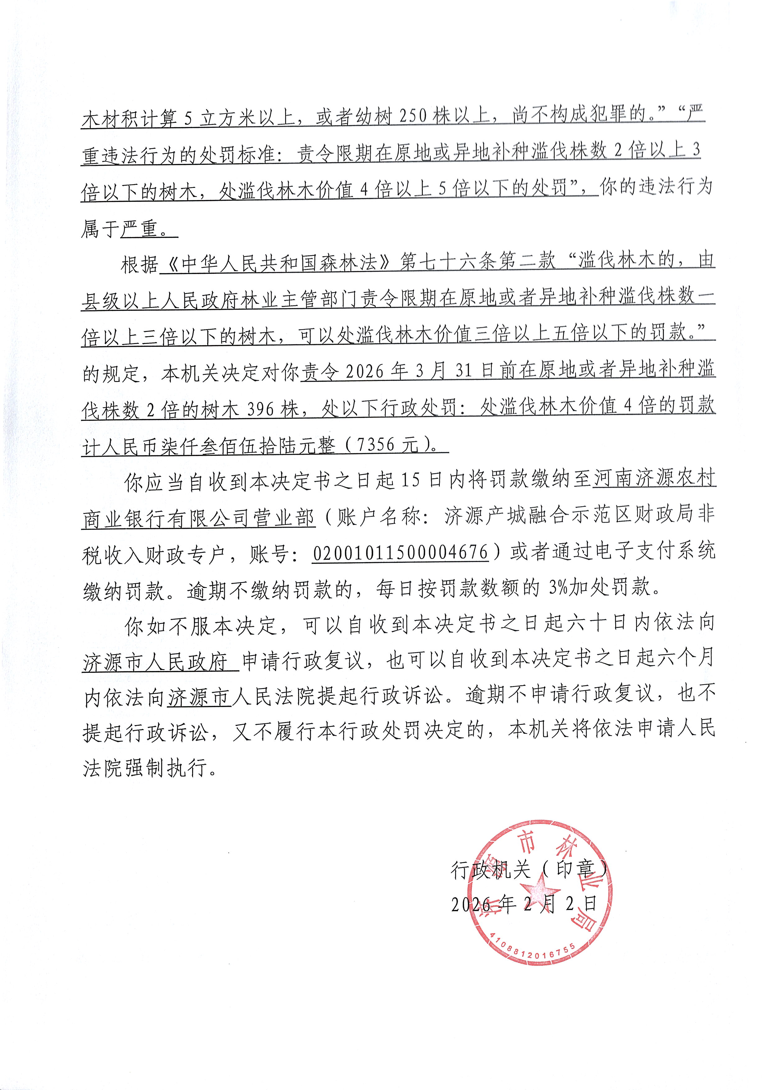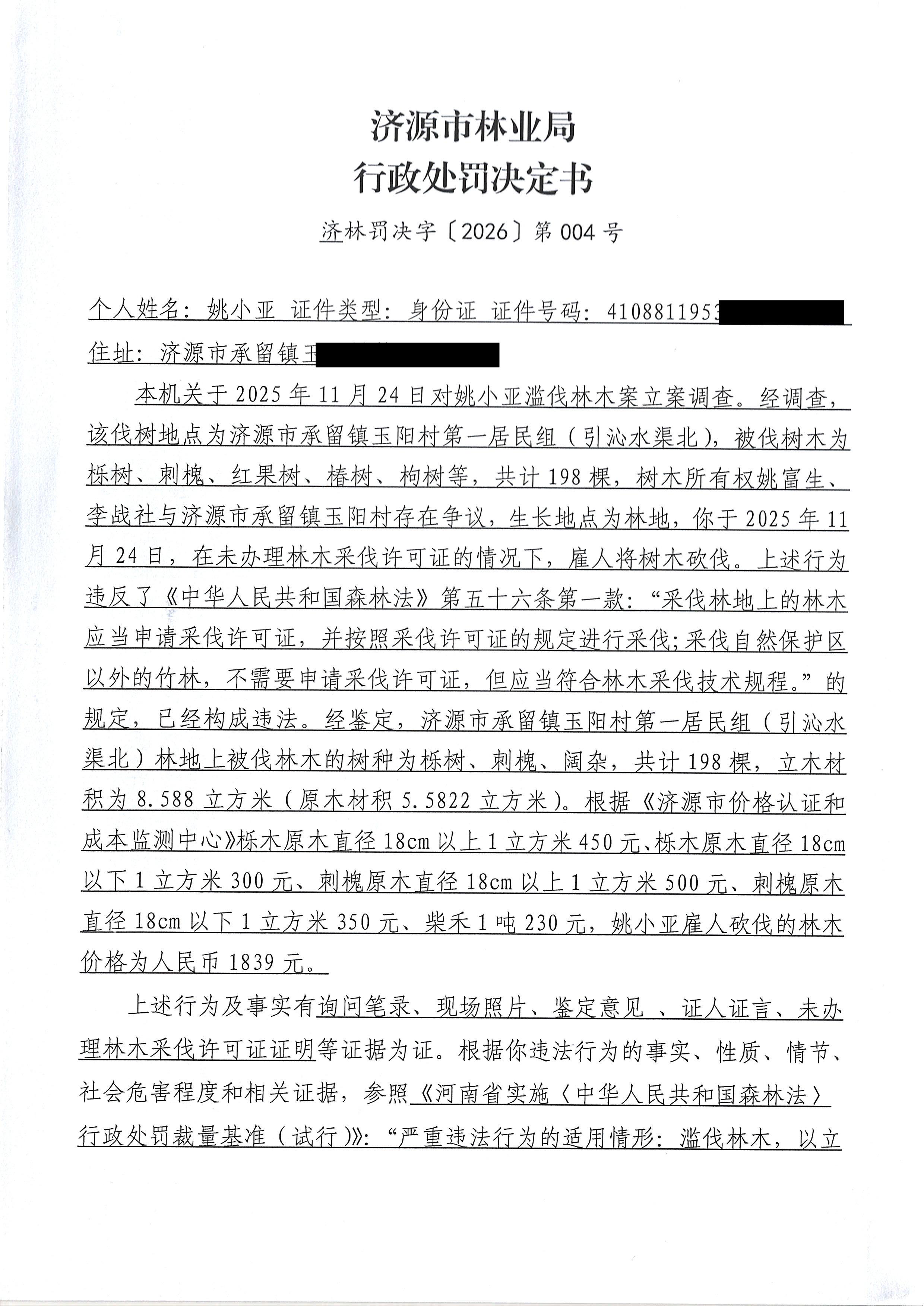 行政处罚决定书(济林罚决字〔2026〕004号)