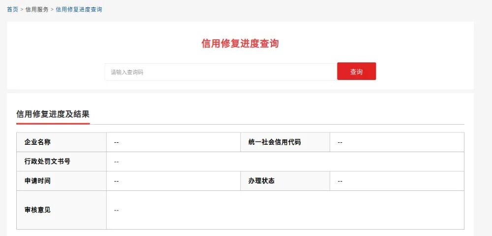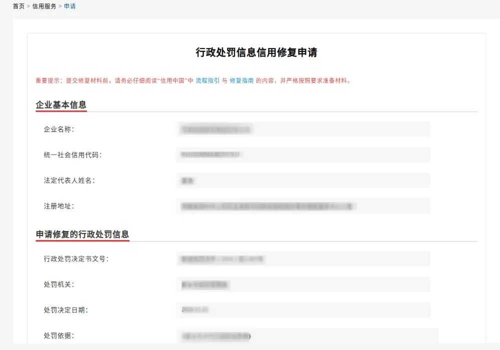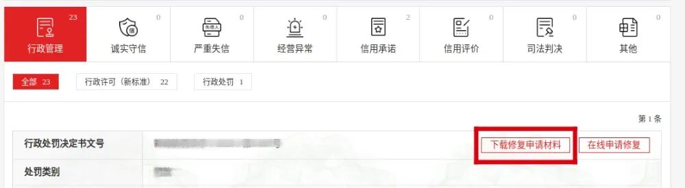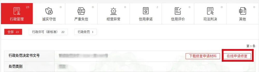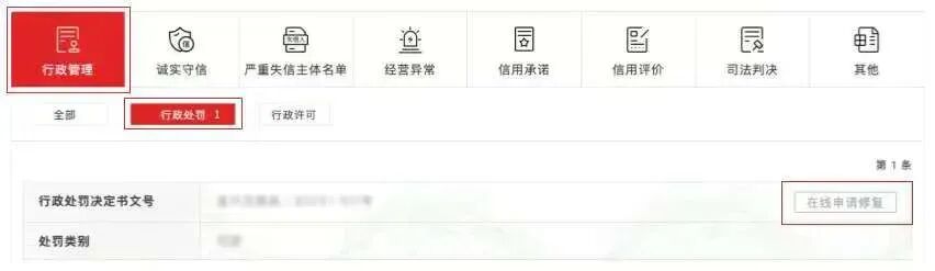 4. 看处罚信息右上角的“在线申请修复”按钮:红色就能申请,灰色就是还没到能申请的最短公示期,得再等等。