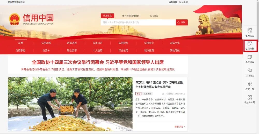 1. 打开“信用中国”网站,点右上角的“信用修复”;